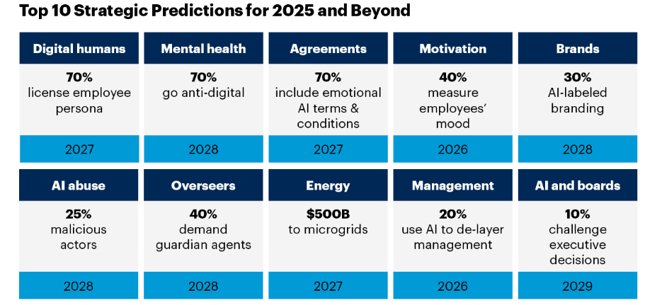 The Gartner AI Outlook 2025 report provides strategic predictions on how AI will reshape industries, management structures, employee dynamics, and business risks, emphasizing the increasing role of AI avatars, ethical concerns, and the operational risks associated with AI automation and decision-making.